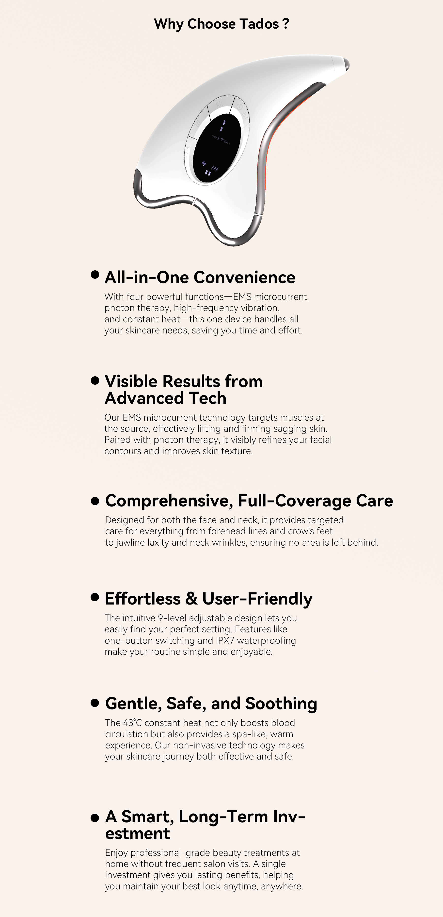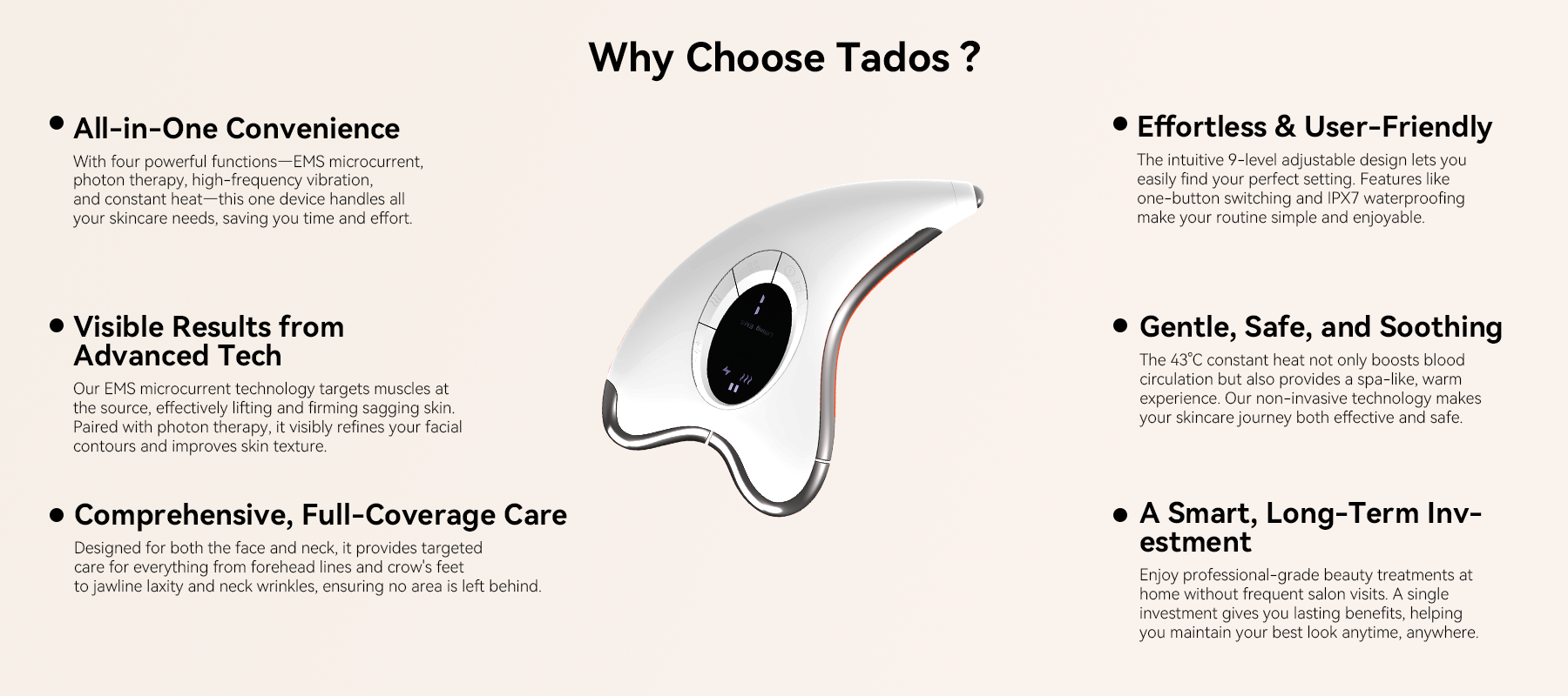 That’s how the Tados Facial Massager was born. Compact and portable, it delivers professional-level skincare anywhere—at home, in the office, or on the go—reviving her skin’s vitality and confidence every day.
